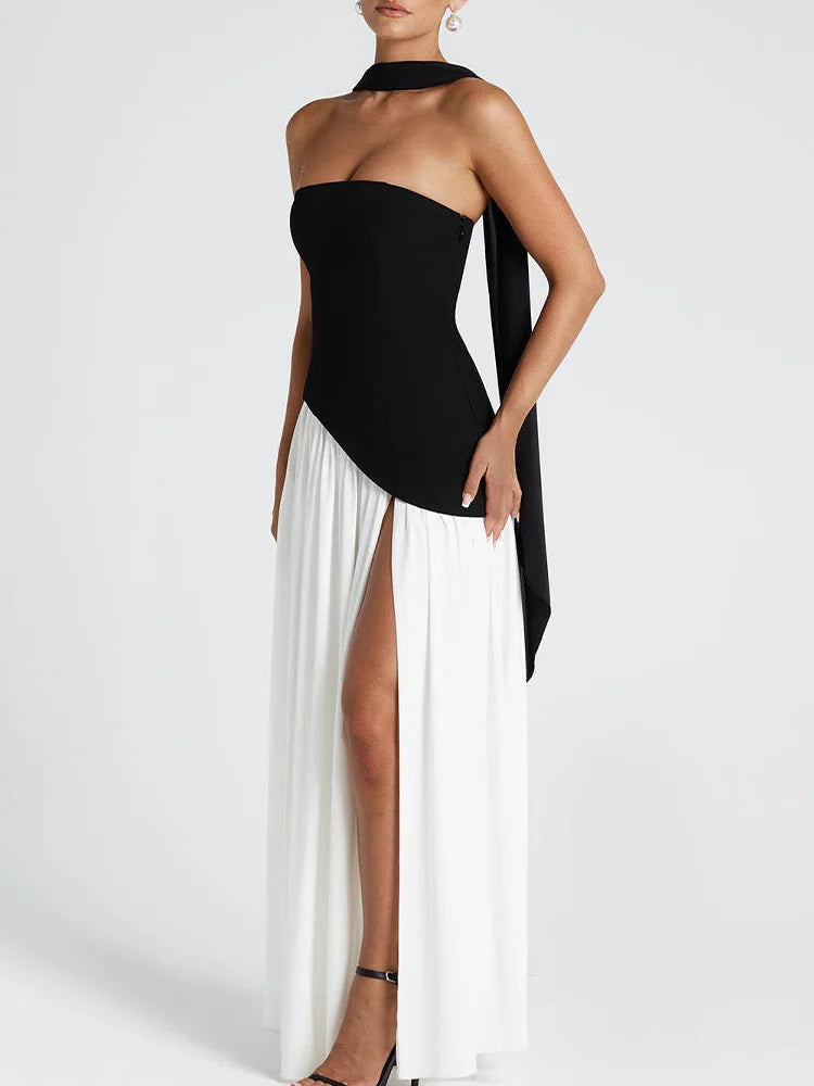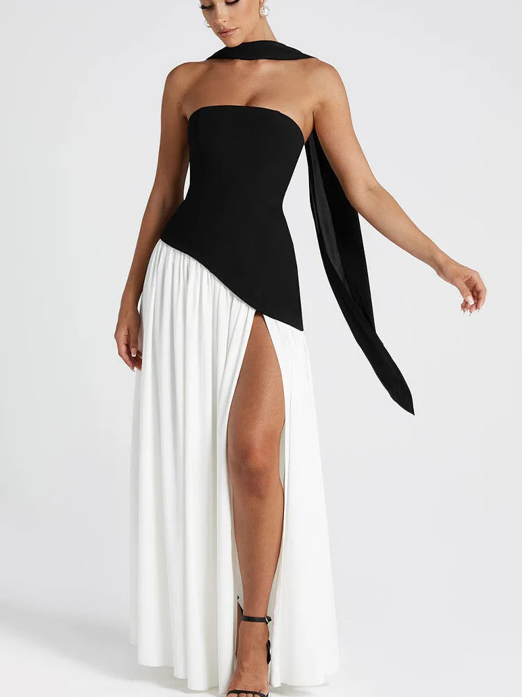 Make a bold statement with this stunning black and white evening dress, designed for elegance and confidence. Featuring a strapless slash neck, a chic asymmetrical hemline, and a dramatic thigh-high slit, this dress is perfect for upscale parties, formal events, or a glamorous night out. Crafted from a premium polyester-spandex blend, it offers a slight stretch for a comfortable yet figure-hugging fit. The contrasting monochrome design adds a modern edge to timeless sophistication.