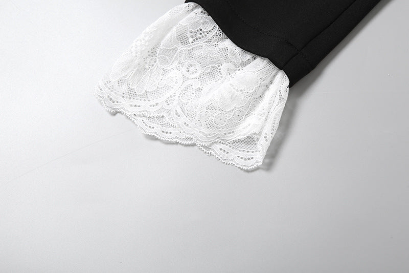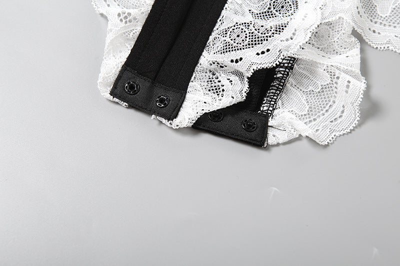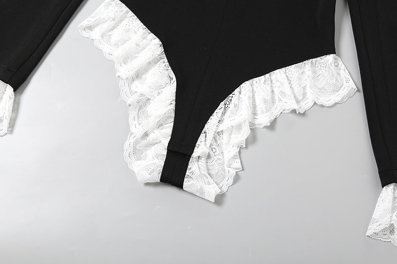 Featuring a structured blazer design with a plunging deep V neckline, this bodysuit is finished with black lace trim at the hem and cuffs for a sophisticated contrast. The long sleeves and sharp shoulders create a strong silhouette, making it perfect for parties, fashion events, or a bold evening look.