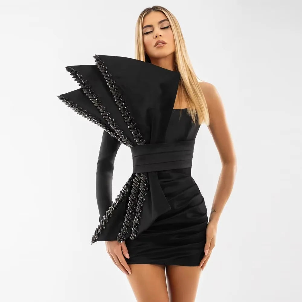 Turn heads in this avant-garde Moonéa Style one-shoulder mini dress, designed with bold architectural detailing and luxury craftsmanship. Featuring a dramatic layered side ribbon embellished with crystal accents, this dress redefines modern glamour. The fitted silhouette highlights your curves while the asymmetric design adds an artistic touch, perfect for evening events, red carpets, or luxury parties.