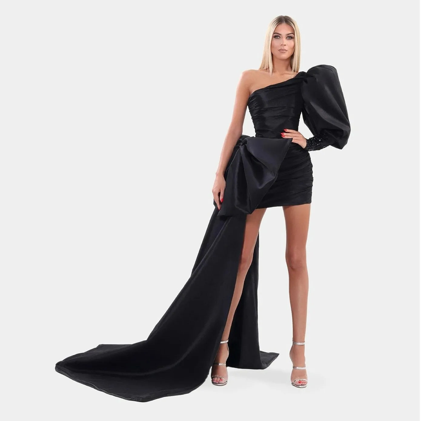 Step into the spotlight with this Moonéa signature couture gown, a perfect balance of modern drama and timeless elegance. Featuring a bold one-shoulder puff sleeve, a fitted mini sheath silhouette, and a voluminous floor-sweeping train, this piece is designed for women who command attention.