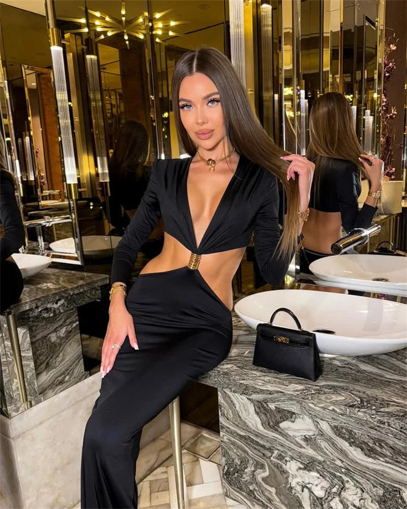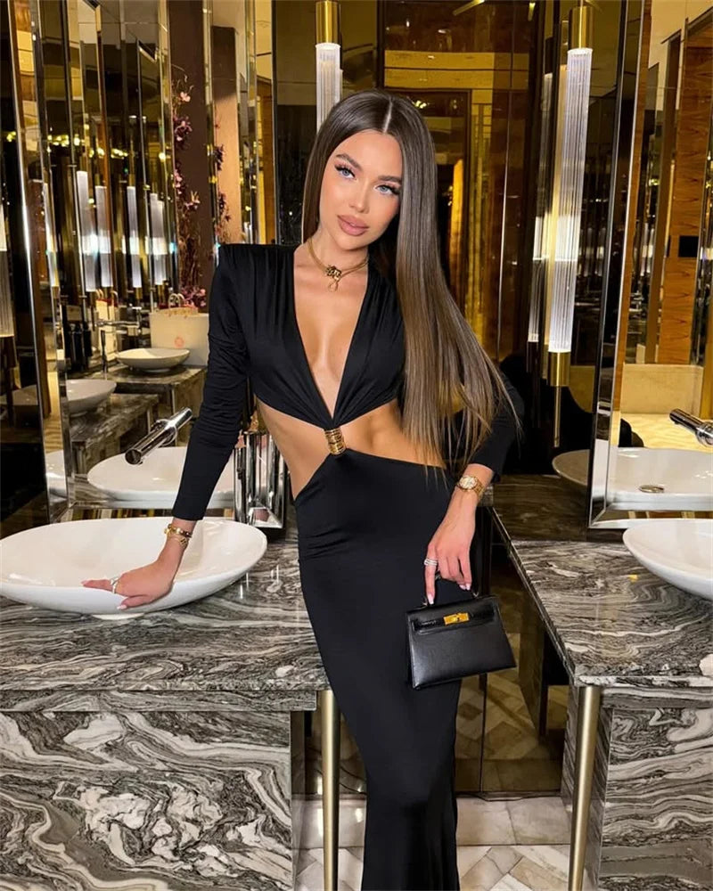 Turn heads with this elegant yet sexy black maxi dress by Mozision. Featuring a bold deep V neckline, long sleeves, and a cut-out hollow waist design, this dress perfectly balances sophistication with allure. The backless style and figure-hugging silhouette make it the ideal choice for evening events, parties, and high-fashion occasions.