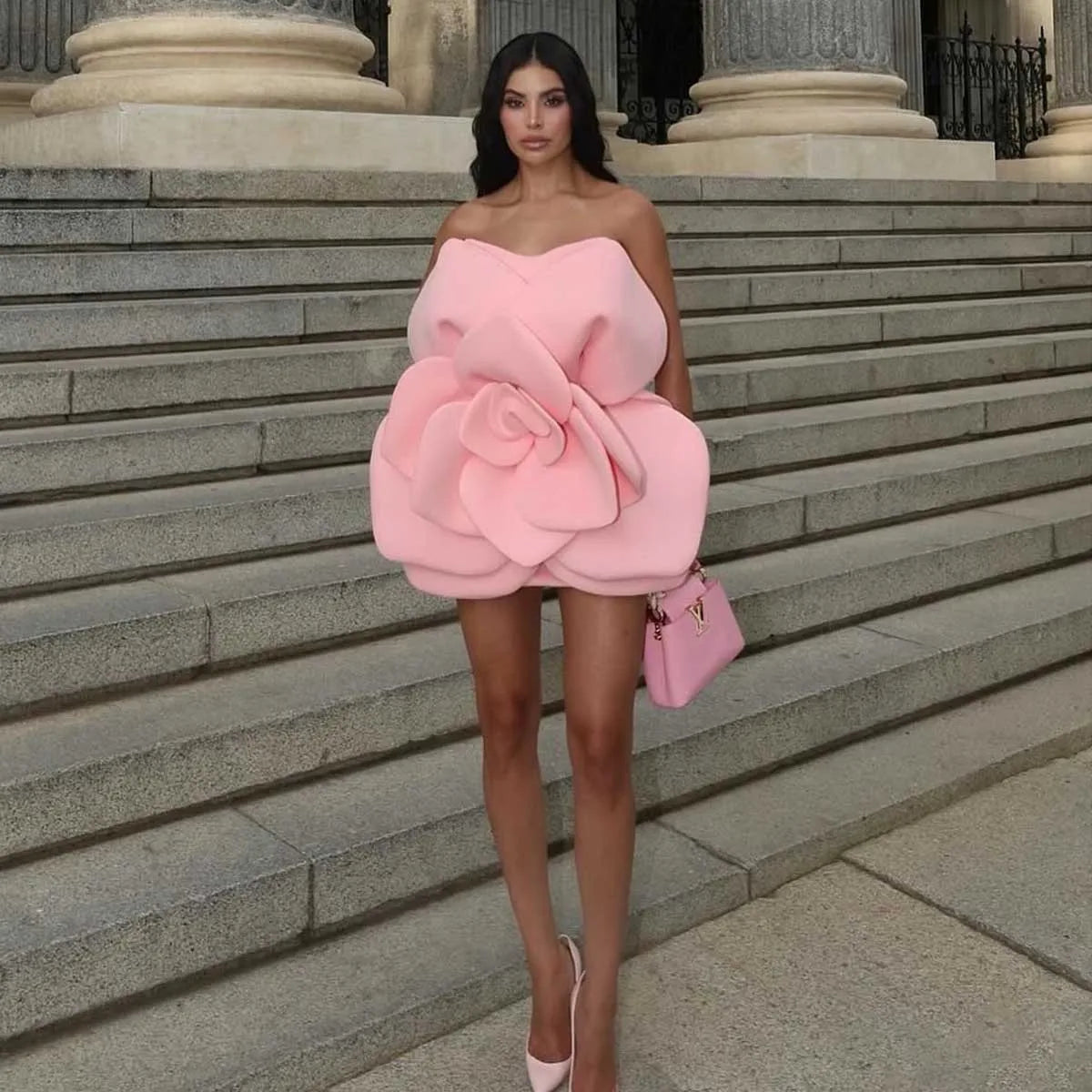 Turn heads with the Blush Bloom Couture Mini Dress — a statement piece that transforms elegance into art. Designed in the shape of an oversized, sculpted rose, this strapless mini dress is crafted from luxurious fabric for a structured yet romantic silhouette. The soft blush pink hue exudes femininity, while the bold floral design ensures you’ll be unforgettable at galas, red carpets, or high-fashion soirées. Paired with matching heels and a chic clutch, it’s the ultimate choice for those who dare to bloom in style.