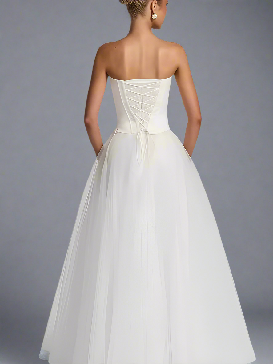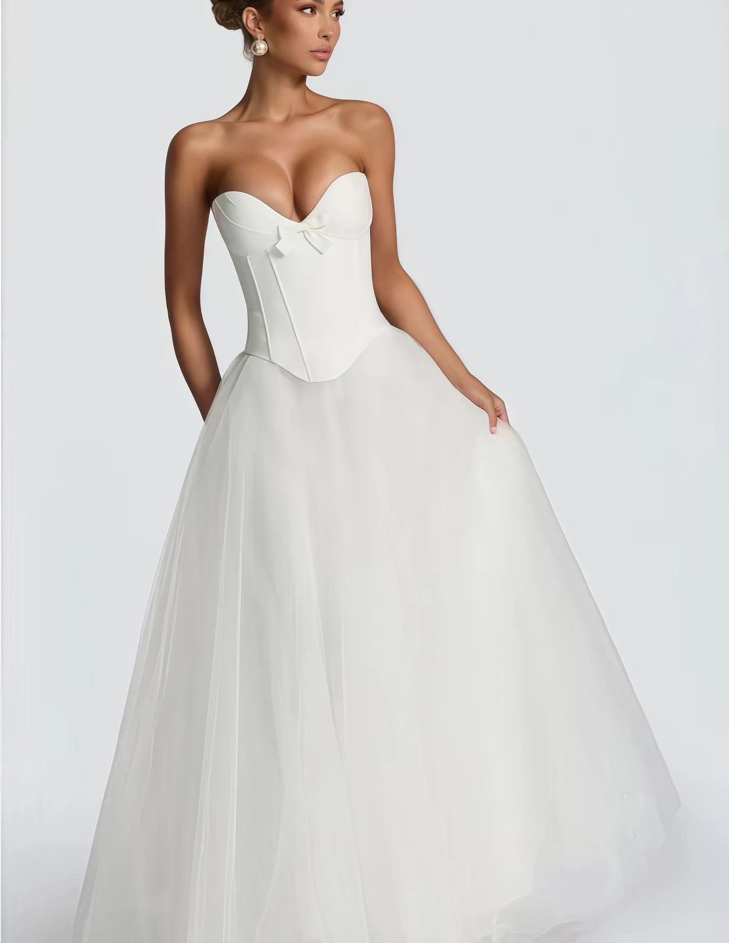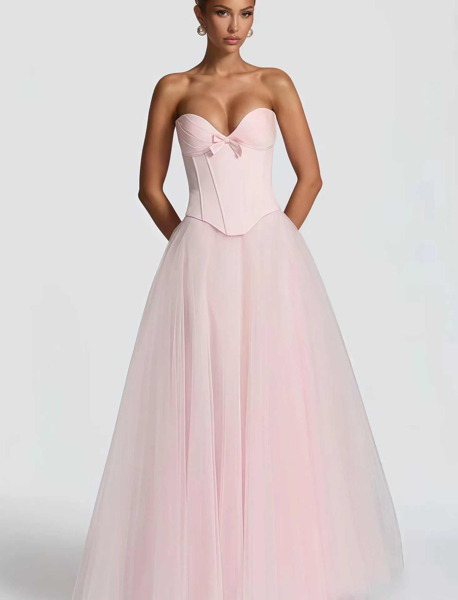 Graceful and timeless, the Moonéa Strapless Corset Tulle Maxi Dress is designed to make a statement. Featuring a structured corset bodice with a delicate bow accent and a flowing layered tulle skirt, this gown perfectly balances elegance and femininity. Available in soft pink and classic white, it’s an ideal choice for evening galas, prom nights, or weddings.