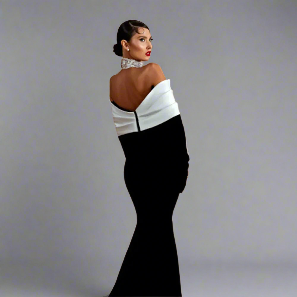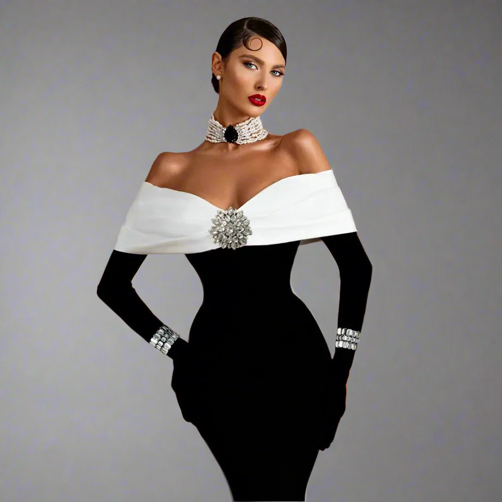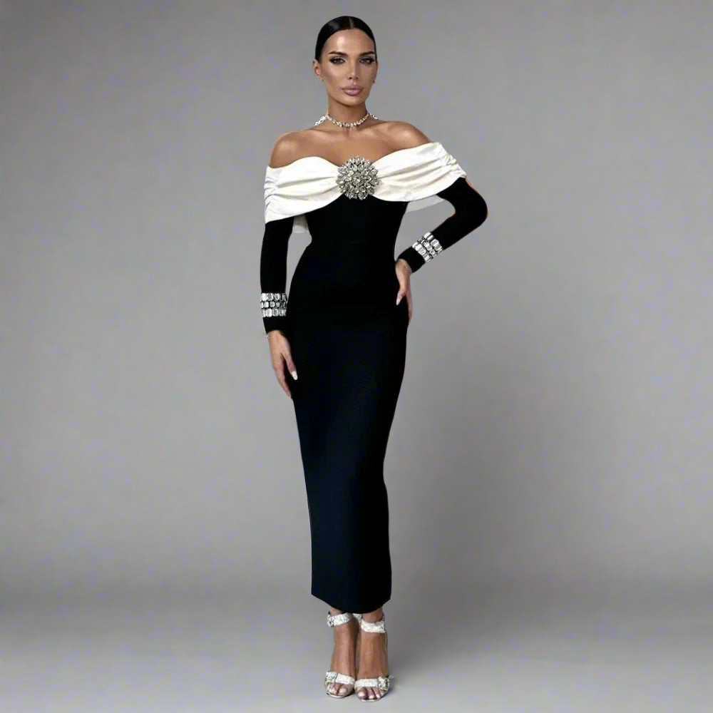Step into timeless elegance with this Moonéa luxury off-shoulder maxi dress. Designed with a sculpted silhouette, this gown features a dramatic white draped neckline, sparkling crystal embellishment, and figure-hugging black bodice that flows into a sleek ankle-length skirt. The long sleeves are finished with diamond-like beaded cuffs for a sophisticated statement.