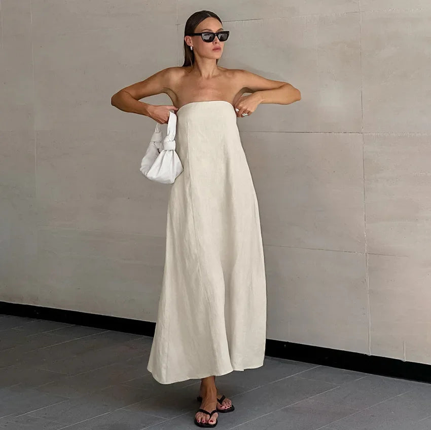 This strapless, sleeveless dress with a loose fit and mid-calf length is the perfect choice for autumn days and a minimalist look. Crafted from polyester with slight stretch, it offers comfort and ease of movement. Its relaxed silhouette makes it ideal for casual wear, while pairing it with a small handbag and minimal heels creates an effortlessly chic style.